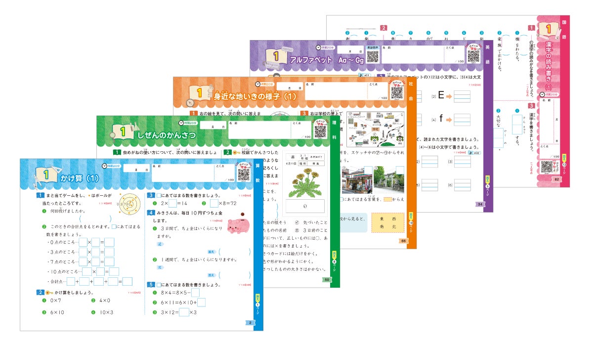 楽しい表紙と1枚ずつ切り取れるドリルでやる気がつづく! シールやデジタル解答などの特典も追加し、さらにお得になりました。