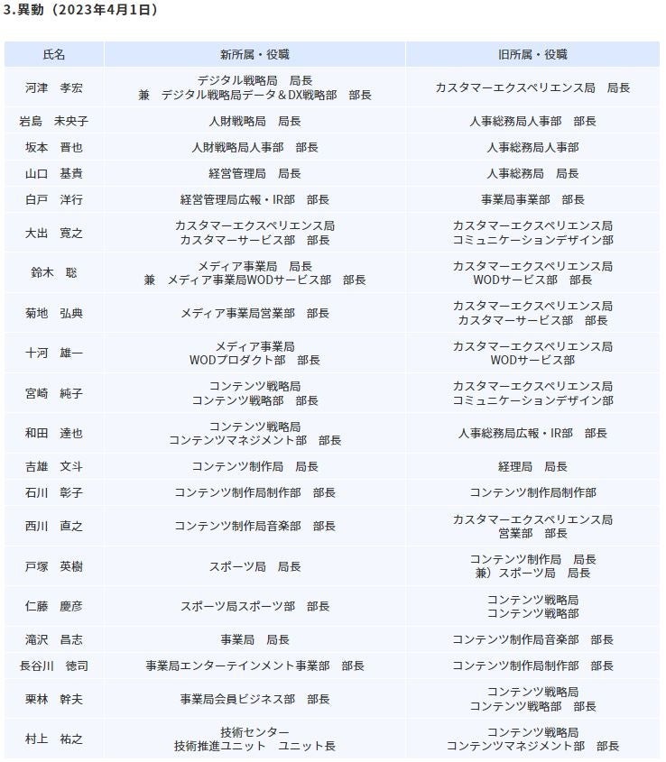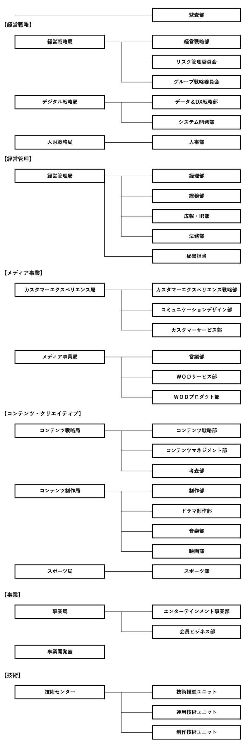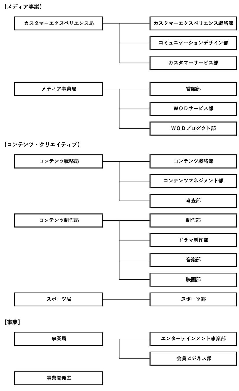 ・「データ&DX戦略部」に「ICT局統括部」の機能および現在の「カスタマーエクスペリエンス戦略部」のDMP機能を移管する。会員の行動履歴や趣向を分析し、コンテンツ開発、サービス改善、新サービス開発につなげていくためのデータの整備や見える化を図る。また最新技術やマーケットの状況をリサーチ・分析し、WOWOWの事業成長につなげる。