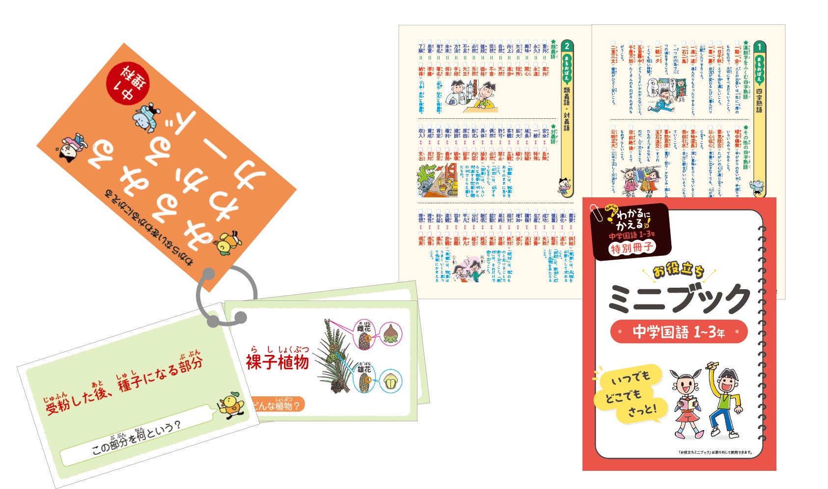 数学・理科・社会・英語には、基本事項や英単語をどこでも確認できる「みるみるわかるカード」がついています。国語には、慣用句・ことわざの意味や文法のポイントをまとめた「お役立ちミニブック」がついています。