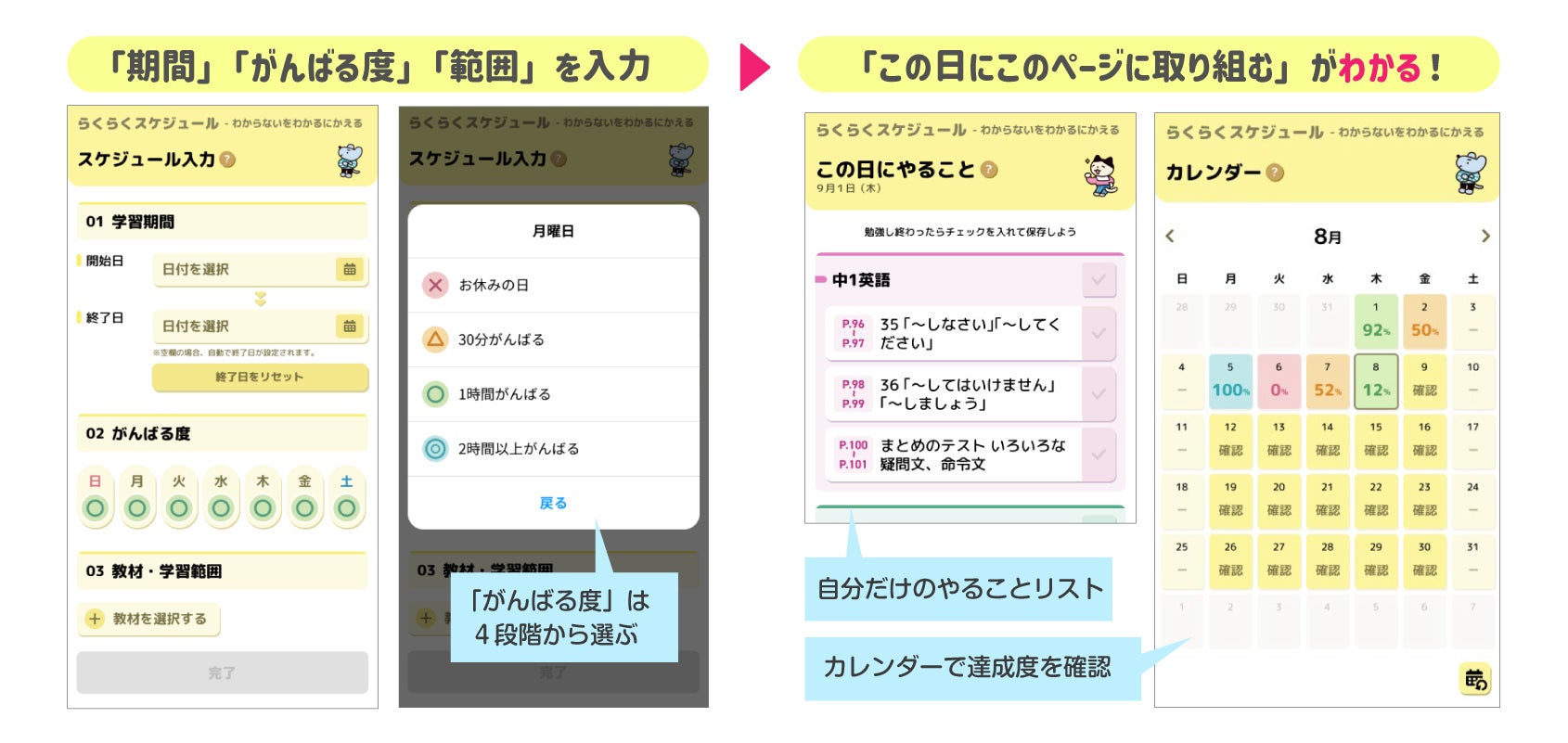 取り組む『わからないをわかるにかえる』を選び、「期間」「がんばる度」「範囲」を入力するだけで、すぐに学習計画が完成します。