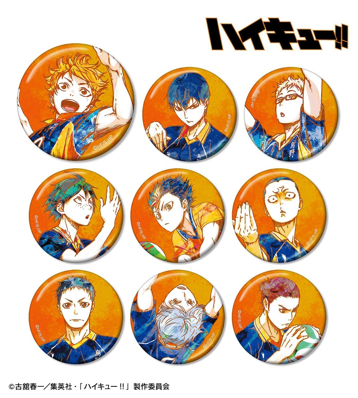 日向翔陽、影山飛雄、月島蛍、山口忠、西谷夕、田中龍之介、澤村大地、菅原孝支、東峰旭のビジュアルを新たなタッチで魅力的に表現し、メタリック仕様の缶バッジに仕上げました。