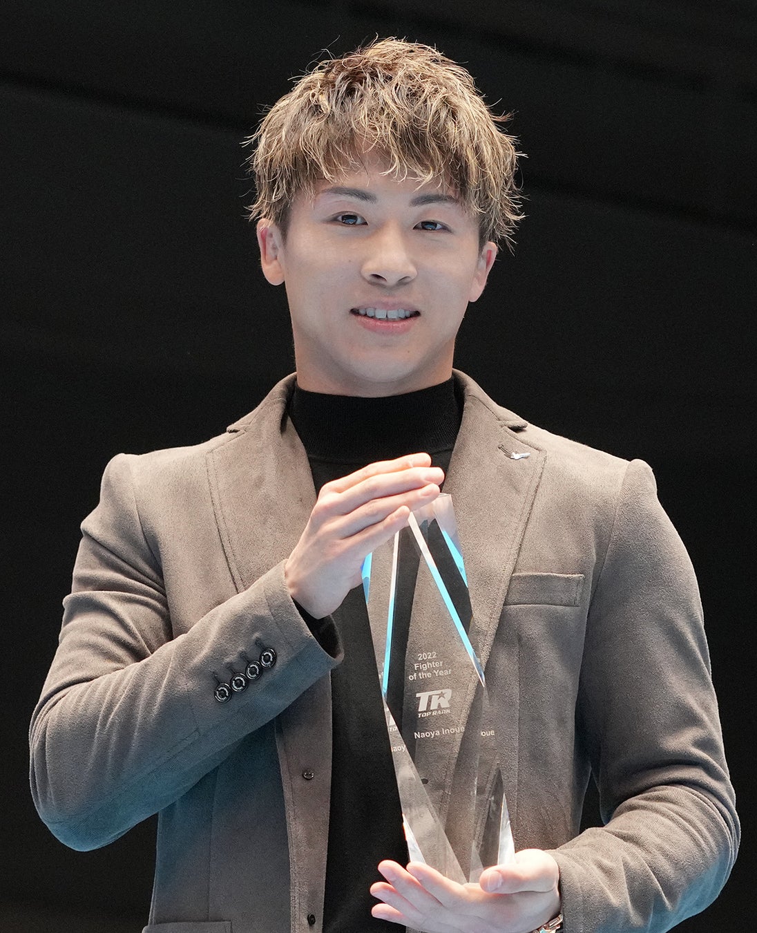 イベント後半には、井上選手が自身の入場曲「BATTLE WITHOUT HONOR OR HUMANITY」(布袋寅泰)で赤コーナーからリングイン。井上選手は「このBATTLEはノニト・ドネア(フィリピン/アメリカ)との初戦と再戦、ポール・バトラー(イギリス)との4団体王座統一戦など特別なときだけに使うんです」と明かした。このあとアメリカの大手プロモーション会社、トップランク社の2022年最優秀選手&KO賞を受賞した井上選手に記念のクリスタルトロフィーが贈呈された。