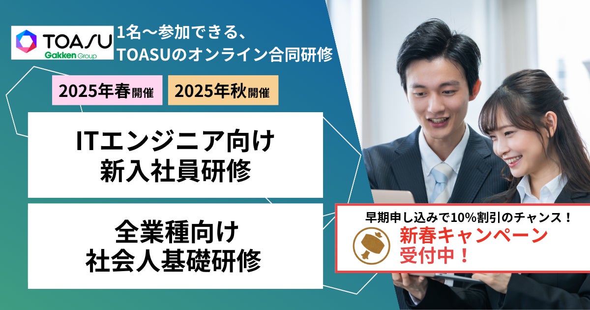 株式会社 学研ホールディングス(東京・品川/代表取締役社長:宮原博昭)のグループ会社、株式会社TOASU(東京・品川/代表取締役社長:宮田 晃)は、2025年1月7日(火)から、「合同オンライン形式ITエンジニア新入社員研修」が定価より10%割引で受講できる新春キャンペーンを実施中です。