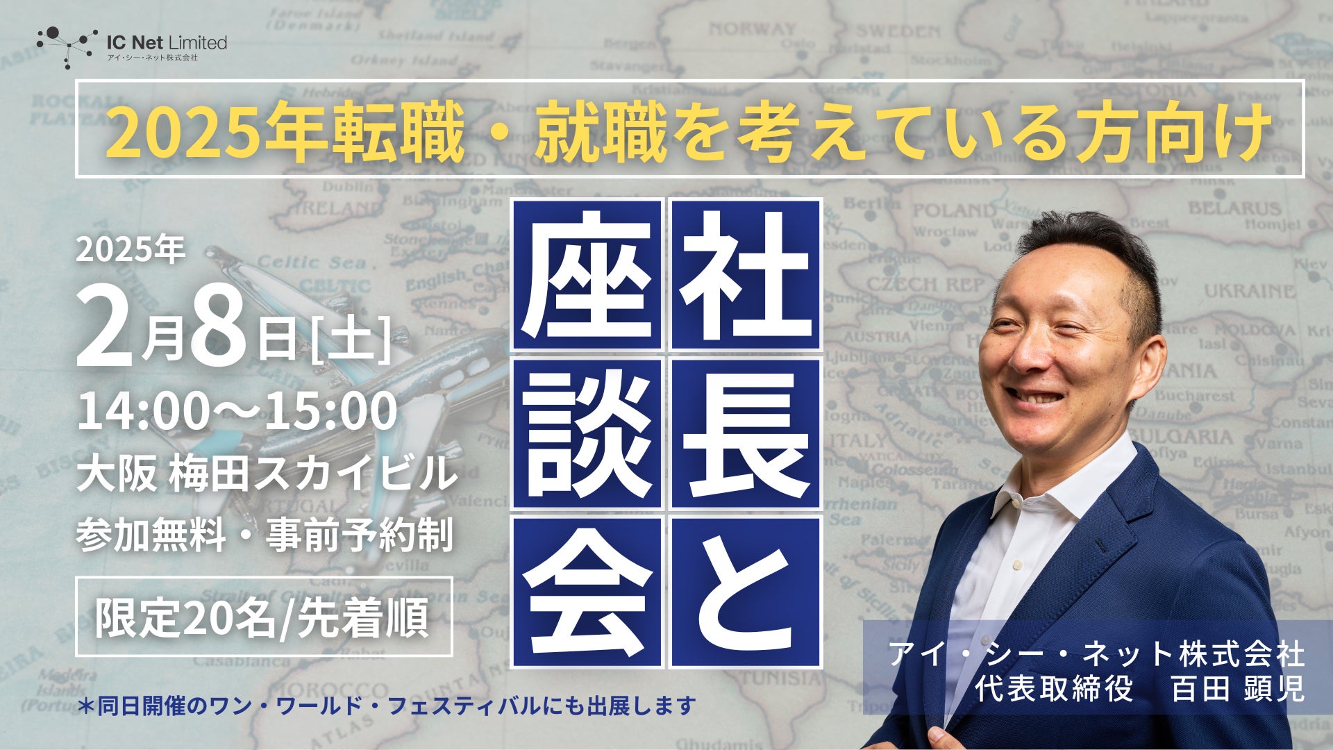 2025年は皆さんと、さまざまなイベントを通して交流をもっていきたいと考えています。アイ・シー・ネットの本社が関東にあるため、なかなか関西で対面イベントを開催する機会がありませんでしたが、今回、大阪での開催が決定しました。セミナーという聴講型のイベントではなく、座談会という対話型のイベントにすることで、皆さんの率直な疑問にお答えしたり、当社がお伝えしたいリアルな話をしたりする場にします。座談会のメインパーソンを当社代表の百田が務めます。いただいた事前質問に対してお答えするほか、社長自ら語る世界の社会課題へのアプローチやビジネスチャンスについて、またアイ・シー・ネットの社員の特徴や業界で働くために必要なことなどを、皆さんとお話させていただきます。
