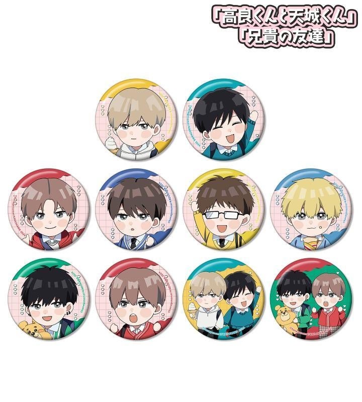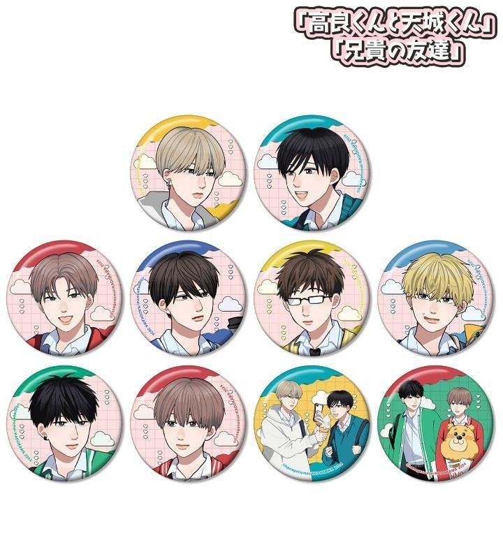 「高良くんと天城くん」4巻の表紙、5巻の表紙、「兄貴の友達」3巻の表紙、「兄貴の友達 僕らのおうち」表紙イラスト、高良瞬、天城太一のイラストを缶バッジに仕上げました。