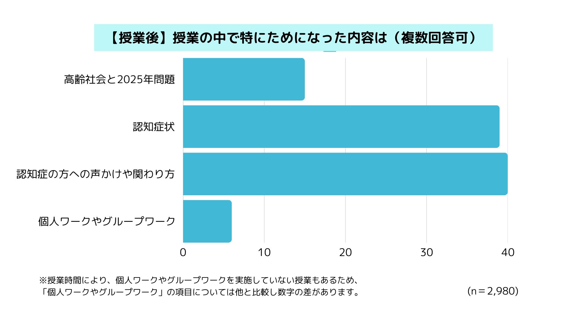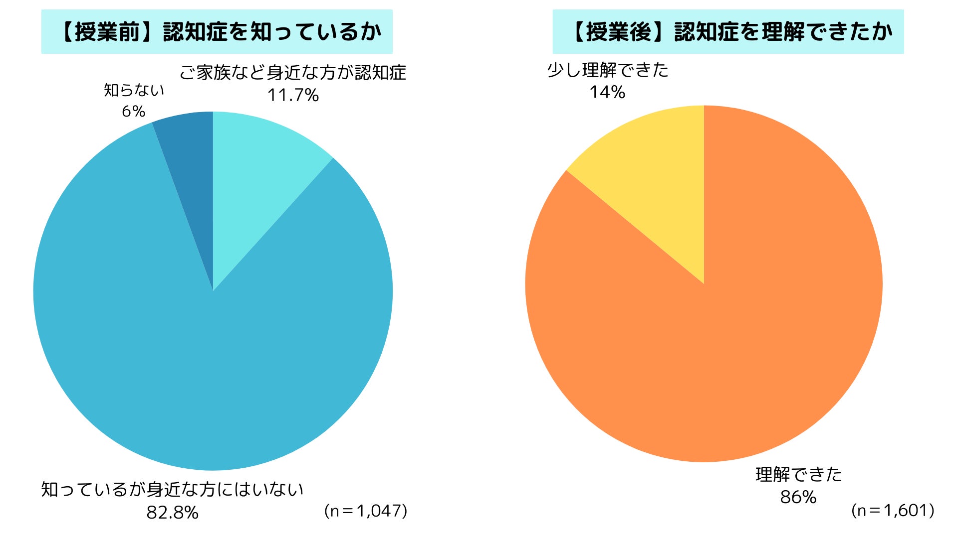 しかし、授業後のアンケートでは、100%が認知症について「理解できた」「少し理解できた」と回答し、認知症を認識し理解できていることがわかる。