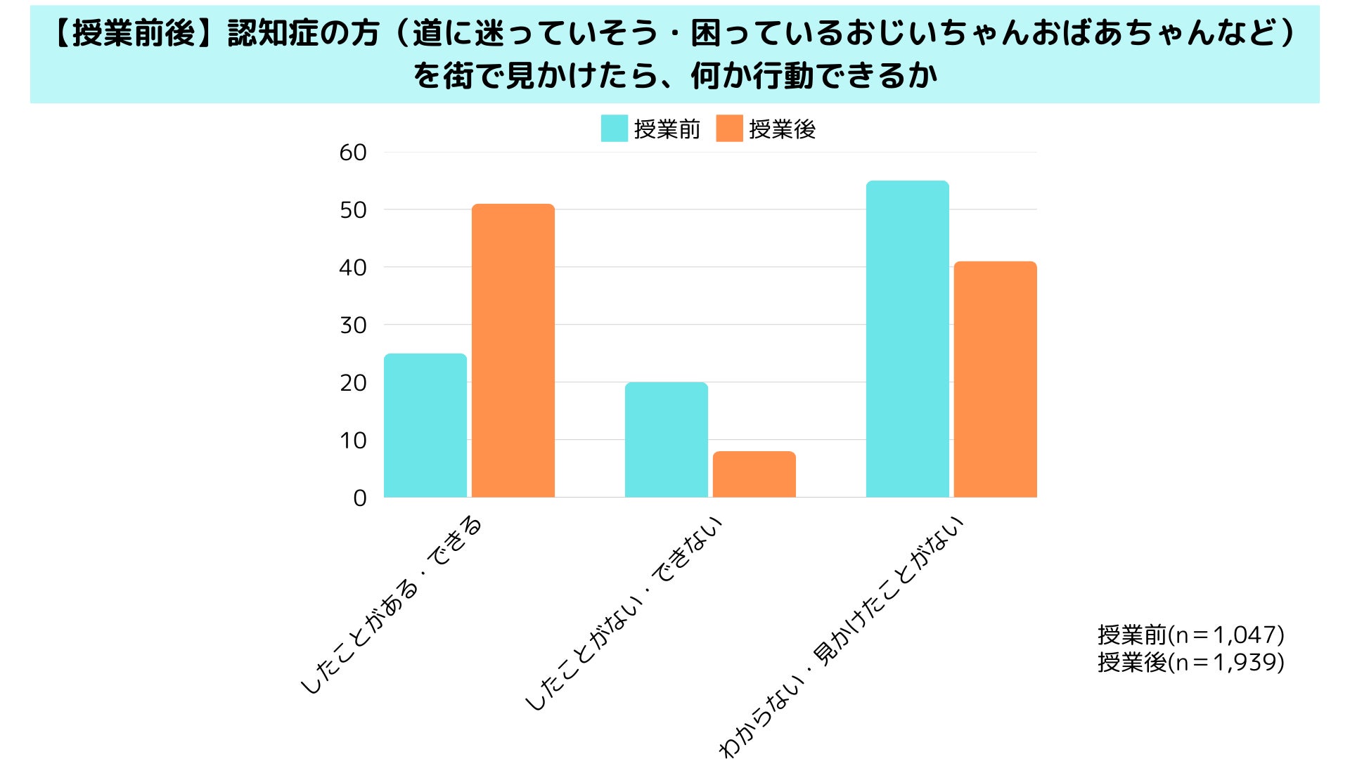 授業前は、「やろうと思っても勇気がでない」「人見知りなので声がなかなかかけられない」などの意見が多く、「したことがある・できる」が約25%だったが、授業後は約50%となった。「認知症は辛いということは想像しただけでわかるし、認知症でも誰もが住みやすい日本にしたいから道に迷っていたり、困っている人を見つけたら、一緒に警察に行って手助けをしてもらうなど、できる限りは協力したいからです。(小学5年生)」「認知症の方も好きでなっているものではないので、相手が認知症で大変な分、私たちが上手にフォローしないといけないので困っていたら助けます。(小学6年生)」など、勇気を出して行動してみようとする意見が多く聞かれた。