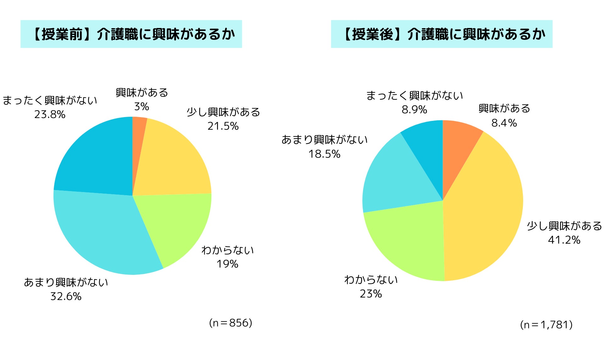 しかし授業後は、「介護職に興味がある」「少し興味がある」との回答が約50%で、授業前の2倍に。「あまり興味がない」「興味がない」も、約27%と半減した。