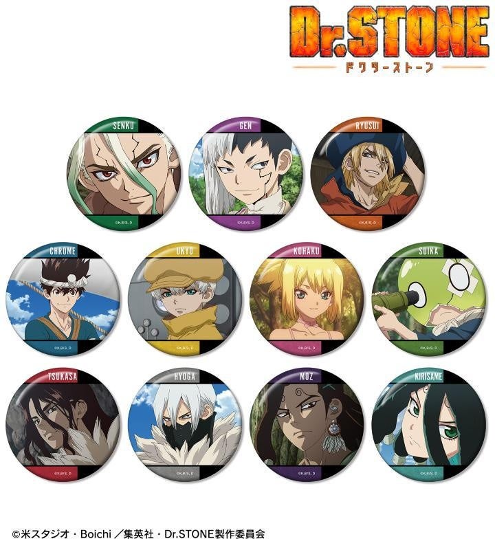 石神千空、あさぎりゲン、七海龍水、クロム、西園寺羽京、コハク、スイカ、獅子王司、氷月、モズ、キリサメの印象的なシーンを缶バッジに仕上げました。