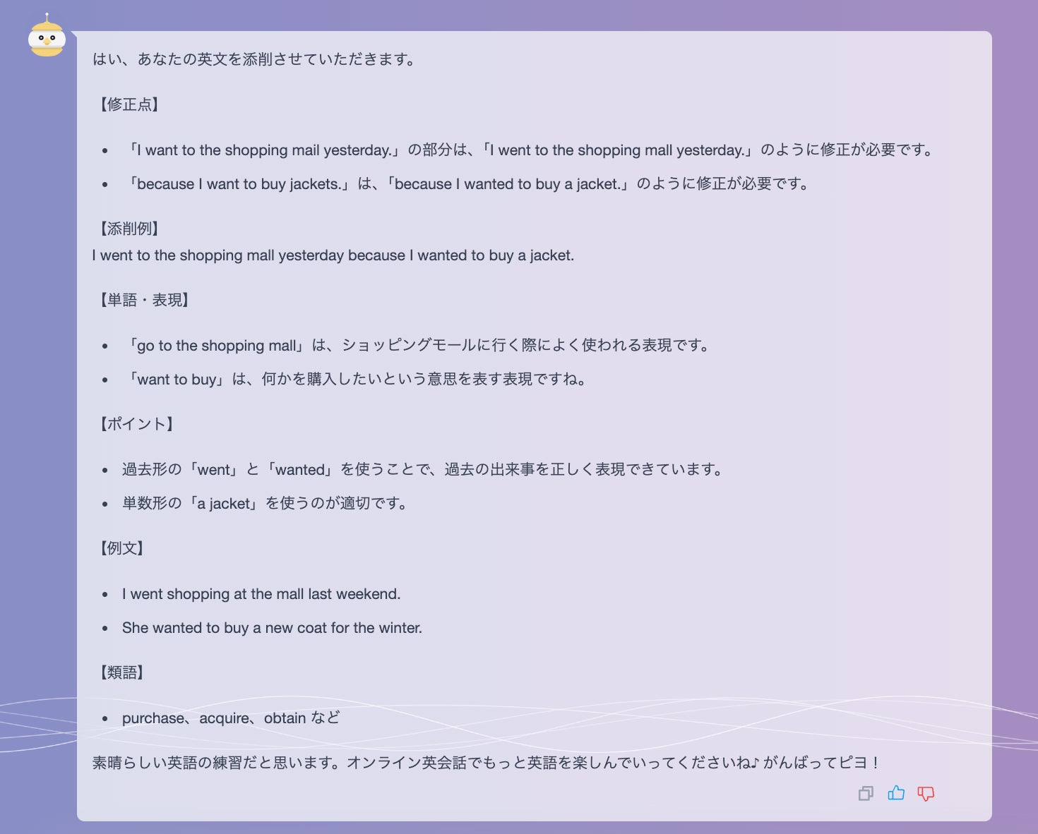 • 例文の提示:修正後の英文を具体的な例文で提示してくれるから、応用が効く!