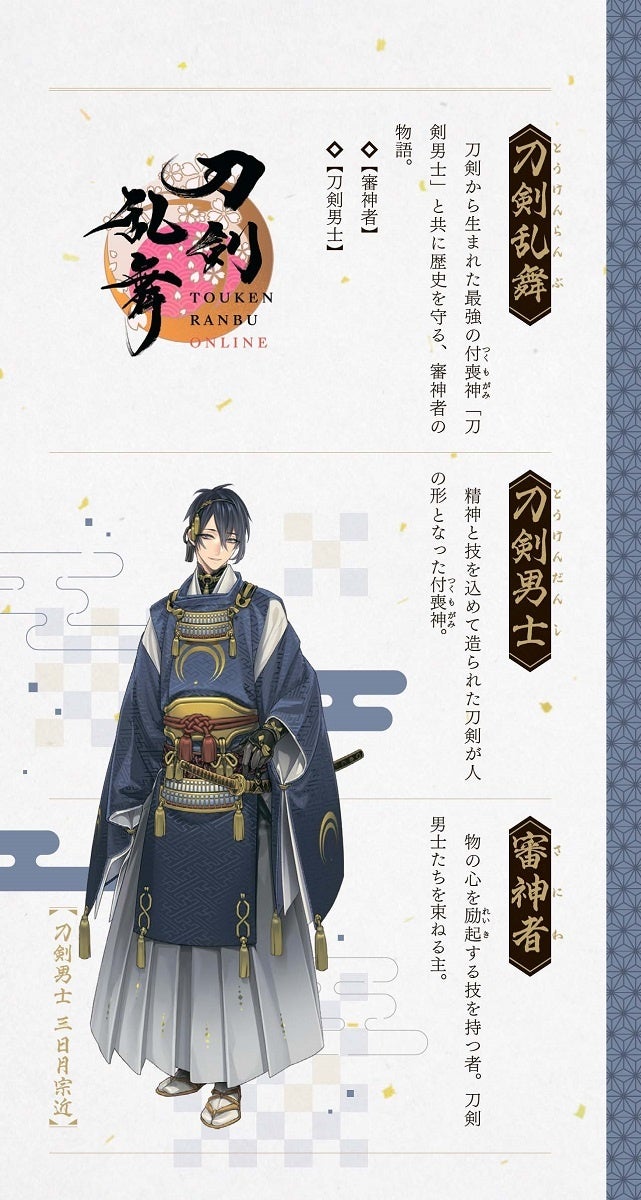 名だたる刀剣が戦士へと姿を変えた「刀剣男士(とうけんだんし)」。あなたは彼らを率いる「審神者(さにわ)」となり、歴史を守る戦いに出ます。短刀、脇差、打刀、太刀、大太刀、薙刀、槍、剣の計8種の個性豊かな刀剣男士を集めて育て、あなただけの部隊を結成! さまざまな合戦場を攻略していく、刀剣育成シミュレーションゲームです。