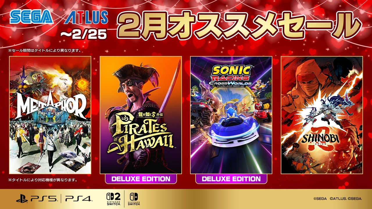株式会社セガは、PlayStation™Storeおよびニンテンドーeショップにて販売中の一部PlayStation®5/PlayStation®4/Nintendo Switch™/Nintendo Switch™ 2用タイトルを対象とし、期間限定で特別価格にて販売する「セガ 2月オススメセール」を開催中です。