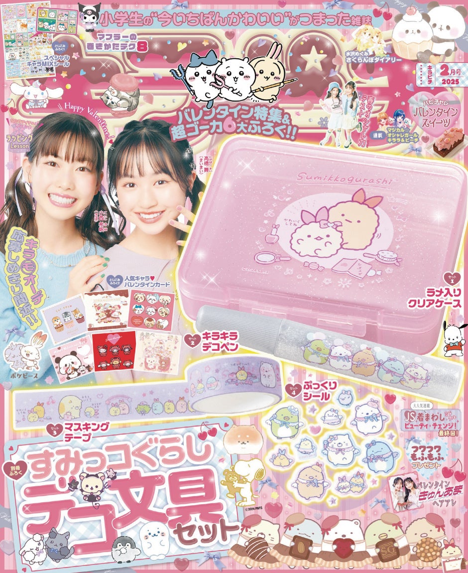 付録は、超豪華なすみっコぐらしのデコ文具セット。本誌では人気キャラクターの連載や小中学生向けのファッション情報、バレンタインレシピなどを紹介しています。公式SNSやYouTube動画も更新中です!
