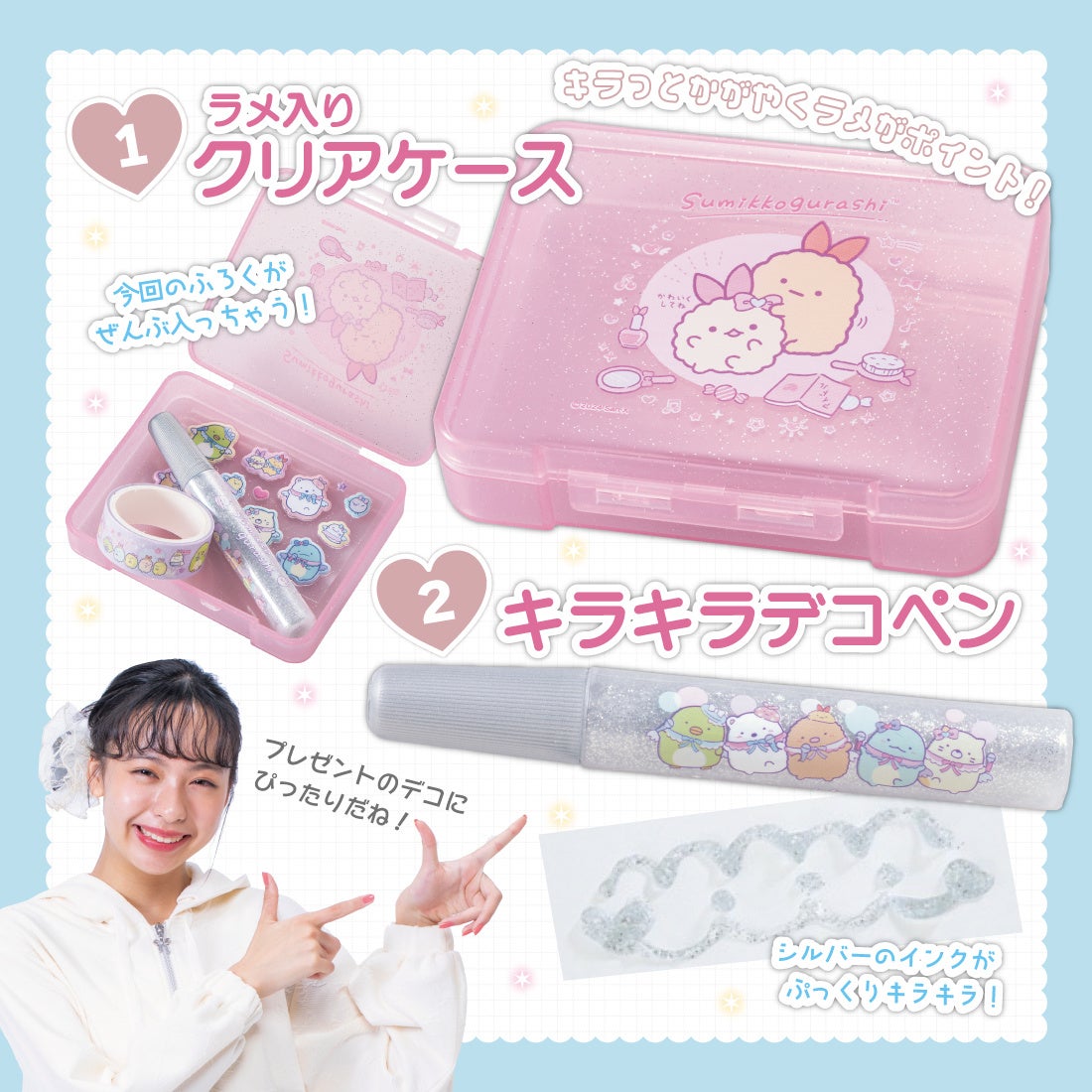 小中学生に大人気のすみっコぐらし! そのキャラクターたちの中でも今、人気急上昇中の「えびてんのしっぽ」と「えびふらいのしっぽ」のイラストがたくさん散りばめられた、かわいらしい付録が完成しました。セット内容は「ラメ入りクリアケース」「キラキララメペン」「マスキングテープ」「ぷっくりシール」の豪華4点! アイドルになるために一生懸命な「えびてんのしっぽ」に癒されながら、プレゼントや手紙をキュートにデコレーションしましょう♪
