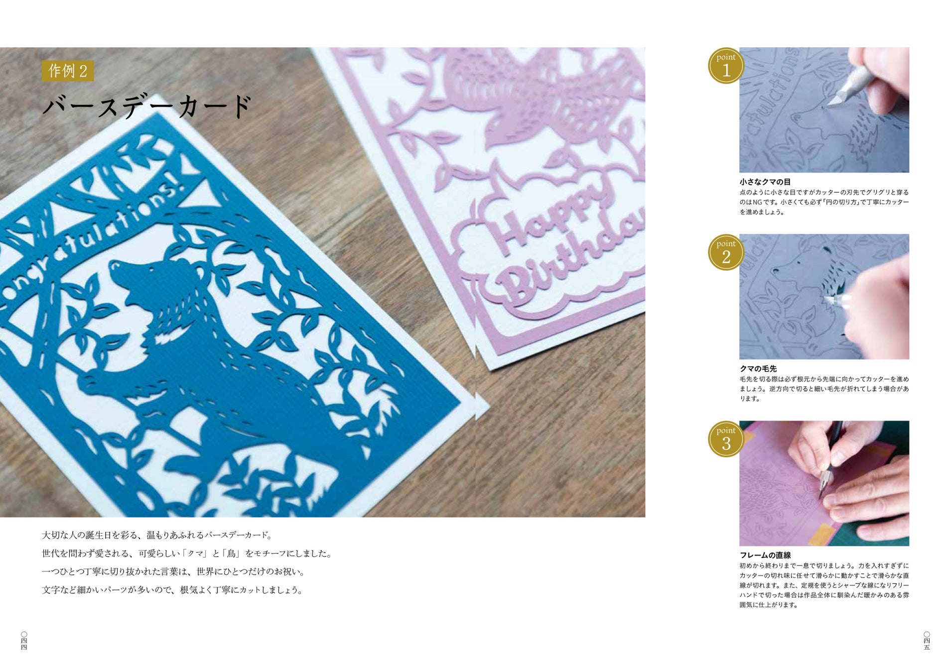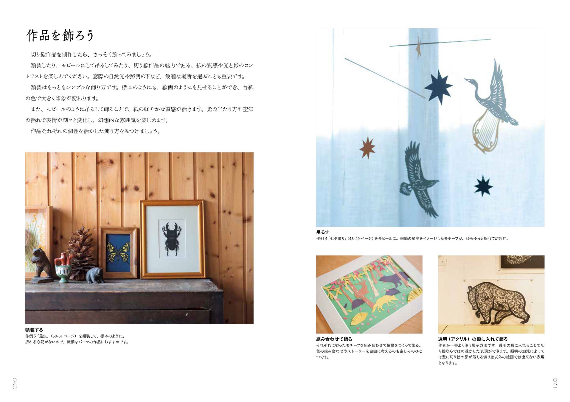 できあがった作品は部屋に飾ったり、お友達へのグリーティングカードにしたりと、用途は多彩です。たのしい切り絵の世界へ、まずはこの一冊から始めてみましょう!