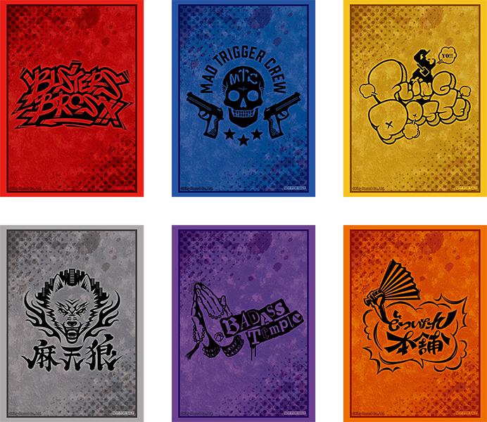 『Buster Bros!!!』、『MAD TRIGGER CREW』、『Fling Posse』、『麻天狼』、『どついたれ本舗』、『Bad Ass Temple』の6ディビジョン、計18名のイラストが多数収録!原作アートワークをふんだんに使用したカードラインナップ!各ディビジョンのキャラクター達が織りなす臨場感をカードでも再現!