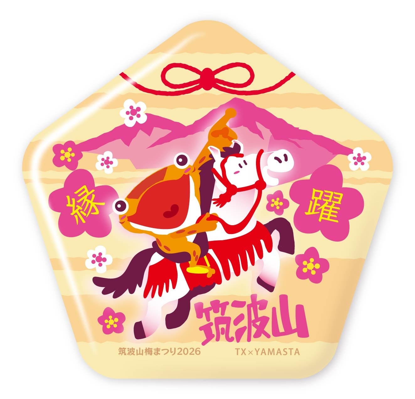 筑波山梅まつり期間中、筑波山スタンプラリーのいずれかのコースを達成すると、達成記念特典に加えて「良縁招福缶バッジ」を先着数量限定でプレゼントします。2026年の干支にちなんで、跳躍する馬と筑波山のガマ君が描かれた、絵馬風デザインの缶バッジです。今年の良縁を願って、梅に彩られた早春の筑波山を巡ってみませんか。