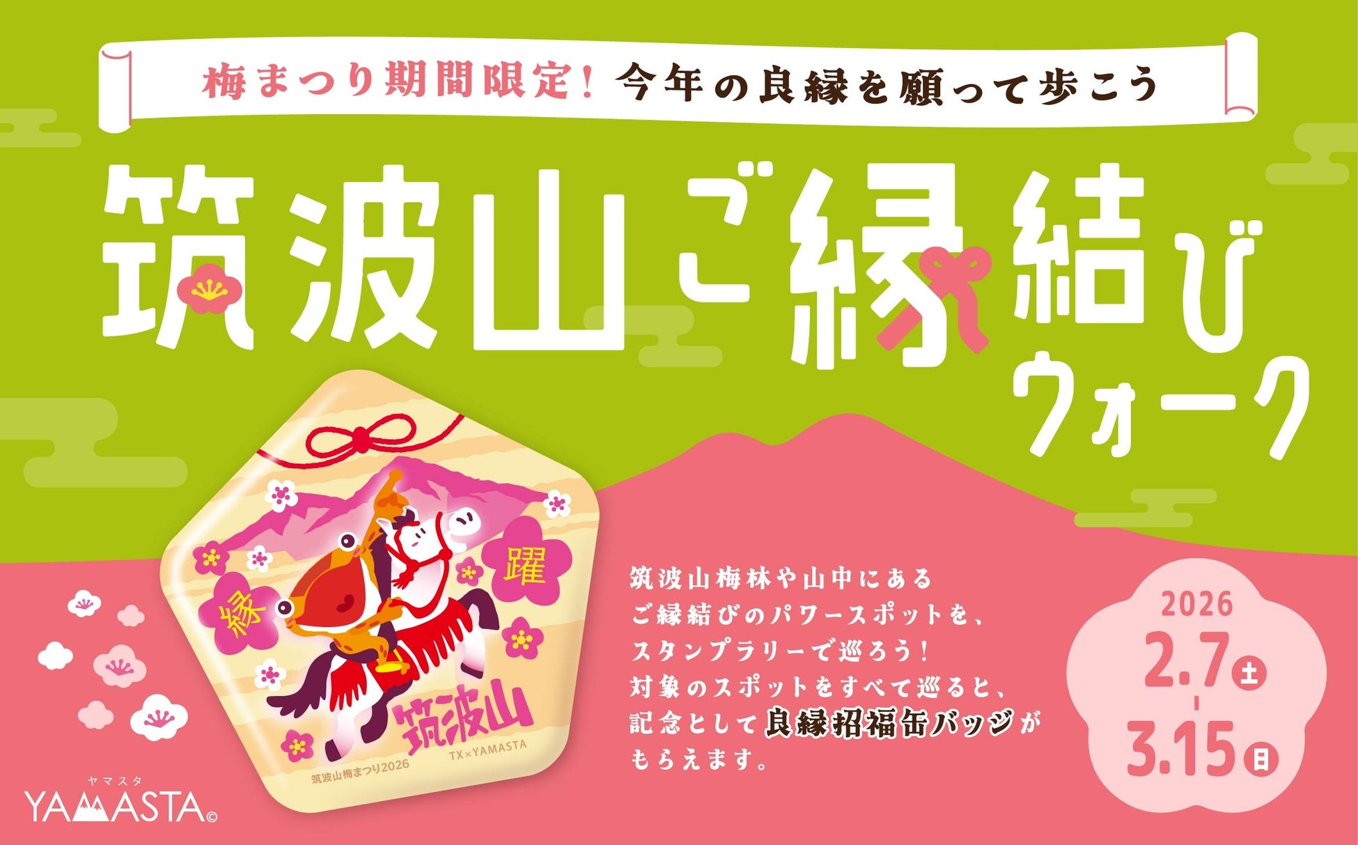 インプレスグループで山岳・自然分野のメディア事業を手がける株式会社山と溪谷社(本社:東京都千代田区、代表取締役社長:二宮宏文)が提供する山のスタンプラリーアプリ(R)「YAMASTA(ヤマスタ)」は、首都圏新都市鉄道株式会社、一般社団法人つくば観光コンベンション協会と協力して、2026年2月7日(土)から3月15日(日)の期間中、「筑波山ご縁結びウォーク」を実施いたします。