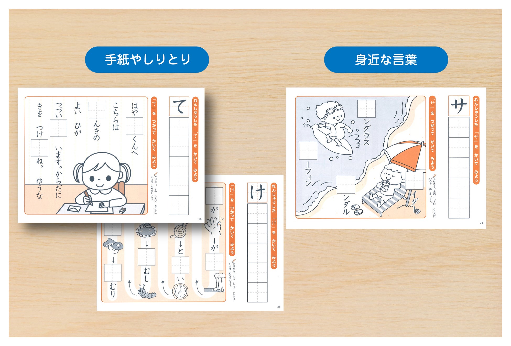 手紙やしりとり、身近な言葉などの題材を使って、楽しく練習できます。イラストの白い部分はぬりえとしても楽しめます。