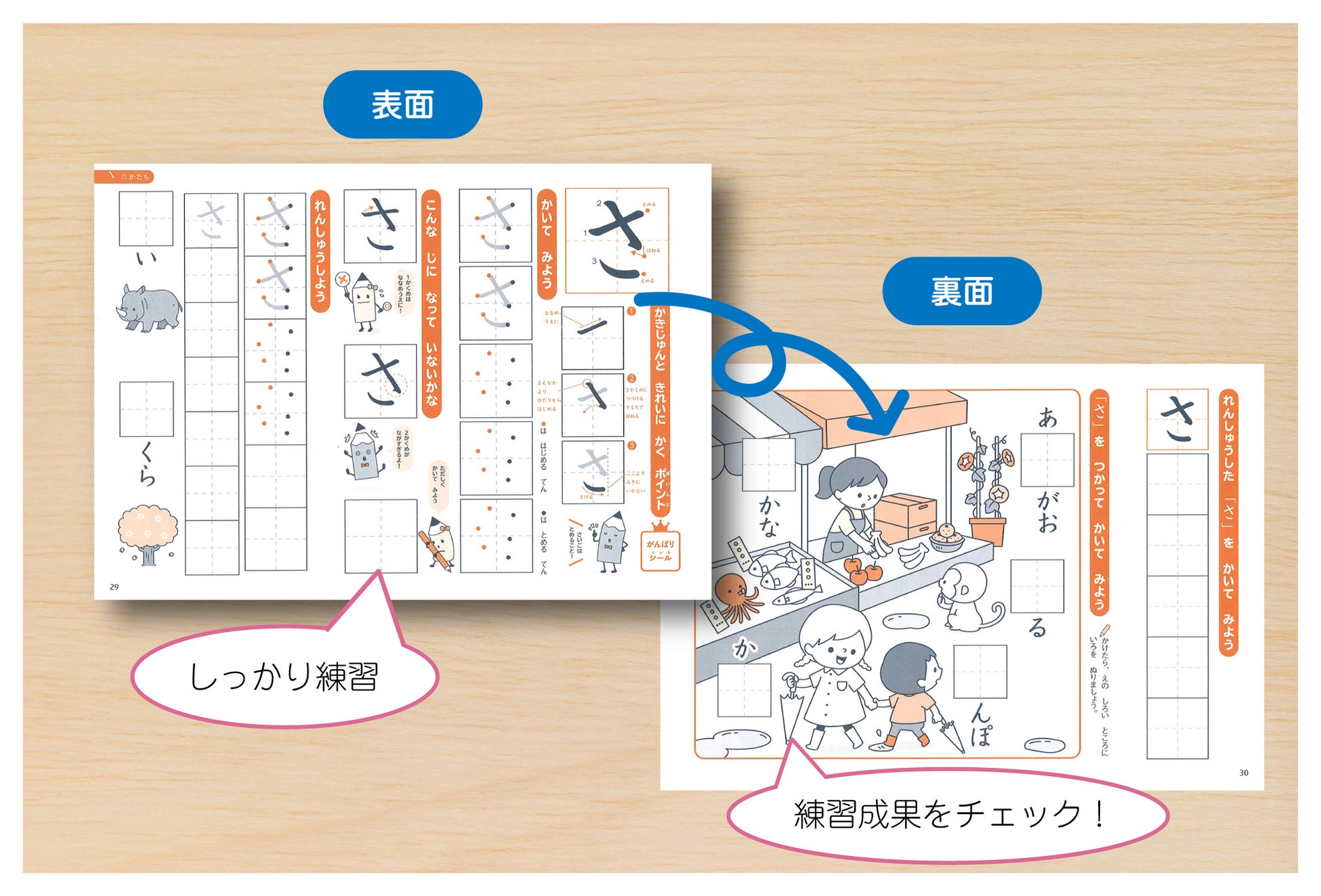 表面でしっかり練習してから、裏面で練習成果をチェックします。表裏合わせて1文字につき30回練習できるので、 着実にステップアップできます。