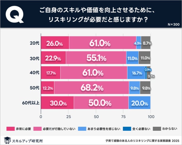 子育て経験者のリスキリングについて、必要性を感じる人は全体で8割を超えた。しかしその中で、全ての年代において50%以上が「必要だが行動していない」を選んでおり、行動に移すための支援や促進策が求められる。