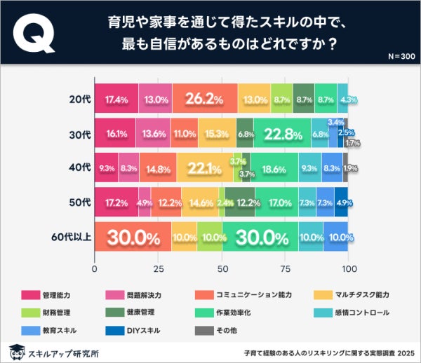 一方、40代は「マルチタスク能力」(22.1%)が突出している。受験や習い事の送り迎え・親の介護が始まるケースもあり、同時に複数の役割をこなすためにプロジェクト管理やスケジュール調整の力が磨かれやすいと推測される。