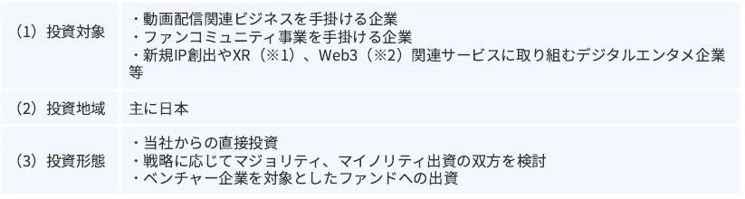 エンターテインメントの領域で動画配信関連ビジネスやファンコミュニティ事業等を手掛ける企業への出資や協業などを行なうことで、オープンイノベーションによる先端技術の導入やコンテンツの新規IP開発、新規事業領域でのビジネスモデルの構築などを目指します。