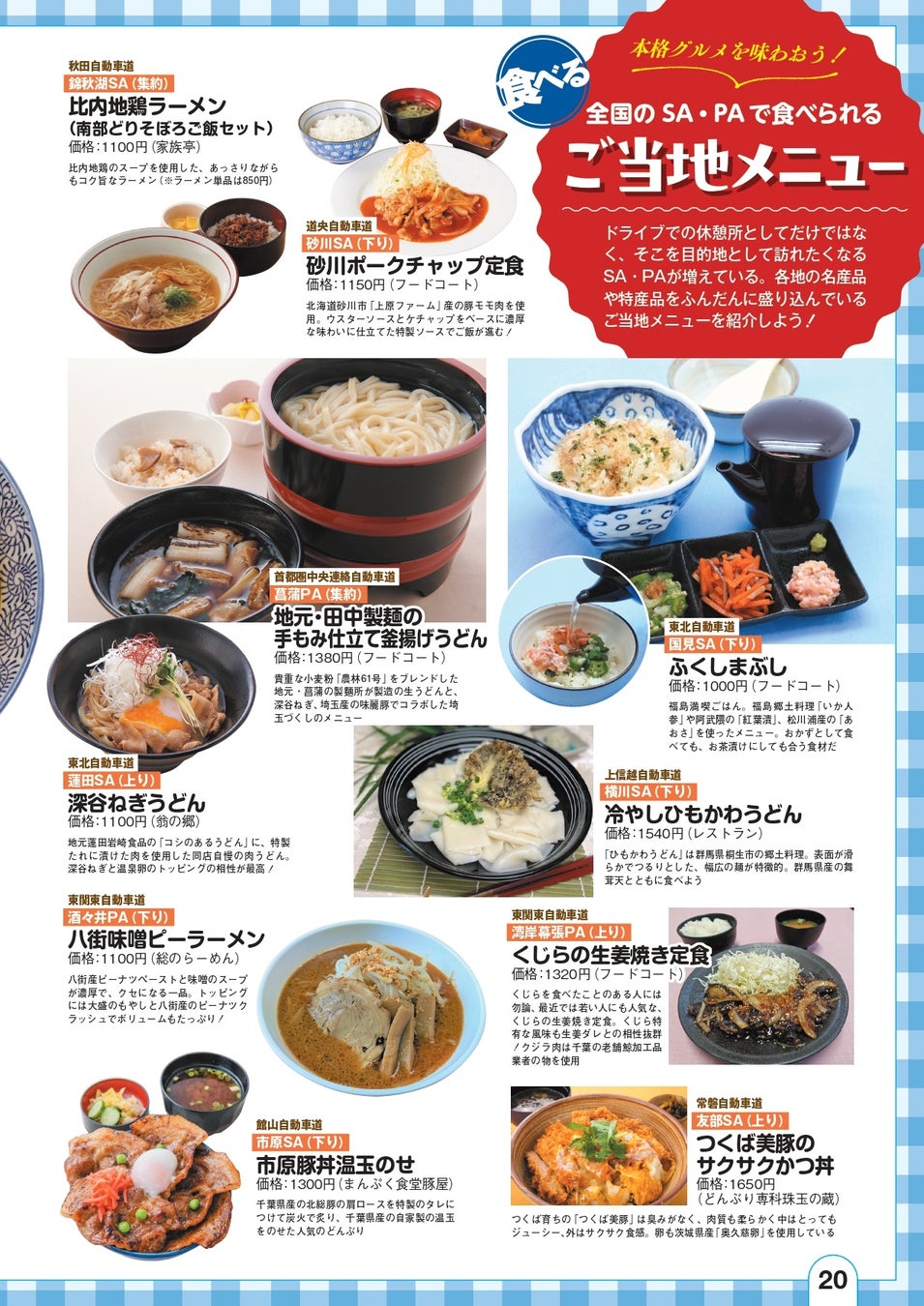 ●SA・PAの「見る、食べる、体験する、買う、遊ぶ」の情報が凝縮! 巻頭企画では「全国のご当地メニュー」を特集。各地の名産品や特産品がふんだんに盛り込まれたご当地メニューならではの味わいを楽しみつくそう!