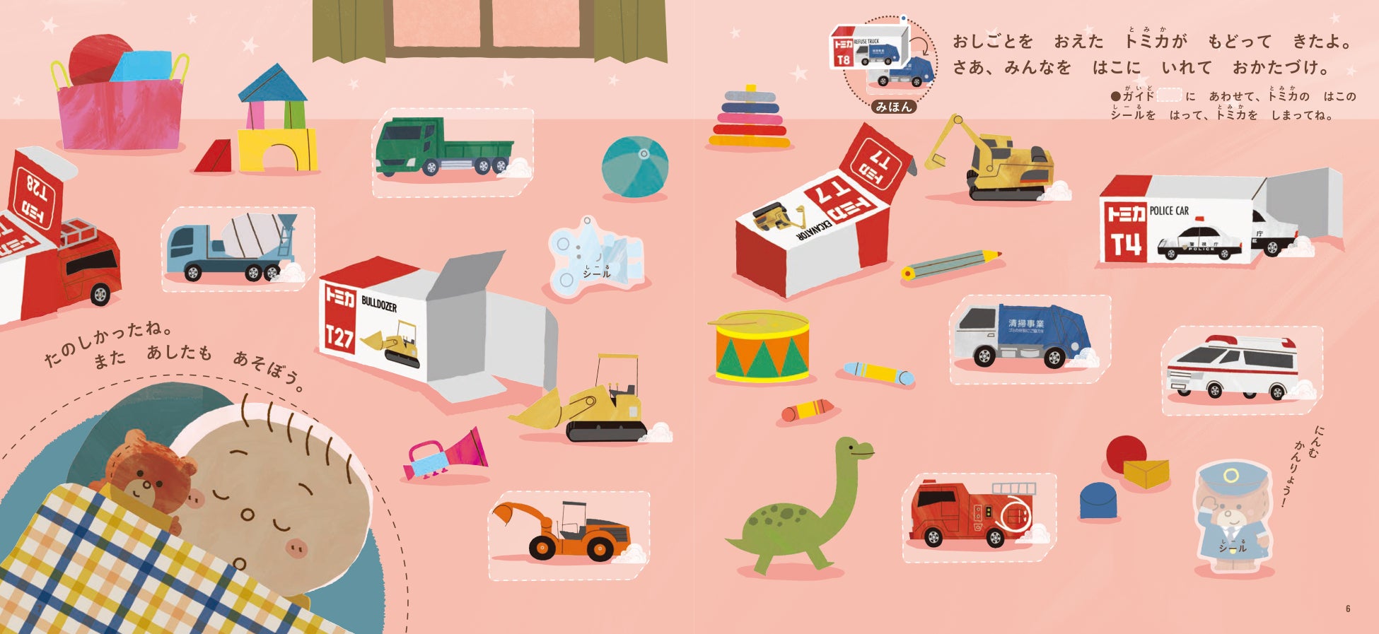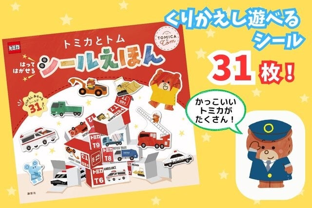 『トミカとトム はって はがせる シールえほん』は3見開きのシールブックで、トミカの箱からぱかっとトミカが登場。最後は箱にお片付けします。31枚のはってはがせるシールには、救急車、消防車、パトカー、清掃車など人気の車が大集合。ぬいぐるみのトムが運転する車もシールになっています。