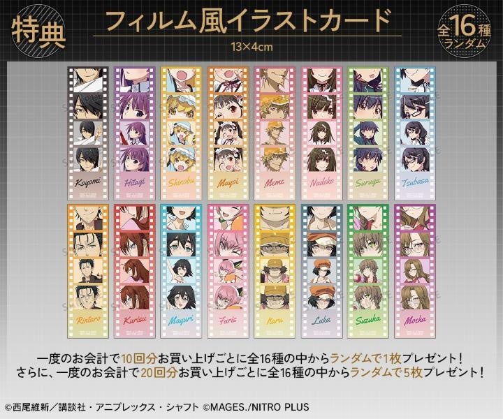 一度のお会計で10回分ご購入ごとに特典フィルム風イラストカード(全16種)の中からランダムで1枚、20回分ご購入ごとにランダムで5枚プレゼント!