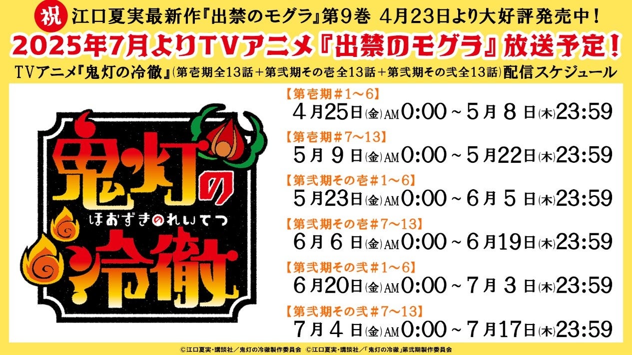 累計発行部数1,500万部突破の人気マンガ『鬼灯の冷徹』などで知られる、江口夏実先生の最新作『出禁のモグラ』第9巻が4月23日より大好評発売中!そして、2025年7月よりTVアニメ『出禁のモグラ』放送開始予定!これを記念して、講談社が運営するYouTubeチャンネル「フル☆アニメTV」にて、TVアニメ『鬼灯の冷徹』第壱期全13話、第弐期その壱全13話、第弐期その弐全13話を順次無料配信いたします。第壱期【1~6話】が本日4月25日から5月8日まで、第壱期【7~13話】が5月9日から5月22日まで、第弐期その壱【1~6話】が5月23日から6月5日まで、第弐期その壱【7~13話】が6月6日から6月19日まで、第弐期その弐【1~6話】が6月20日から7月3日まで、第弐期その弐【7~13話】が7月4日から7月17日までの期間限定配信となりますので、『出禁のモグラ』最新刊と一緒にぜひお楽しみください!