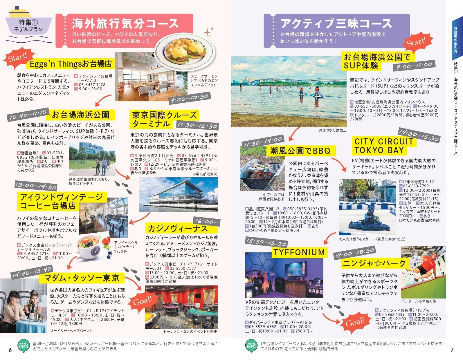 お台場の新たな楽しみ方を徹底解説! 海外旅行気分に浸る、アクティブに楽しむ、などタイプ別モデルコースや、グルメ、宿泊情報が満載。都内商業施設などで配布するほか、ウェブサイトでデジタル版も公開します。