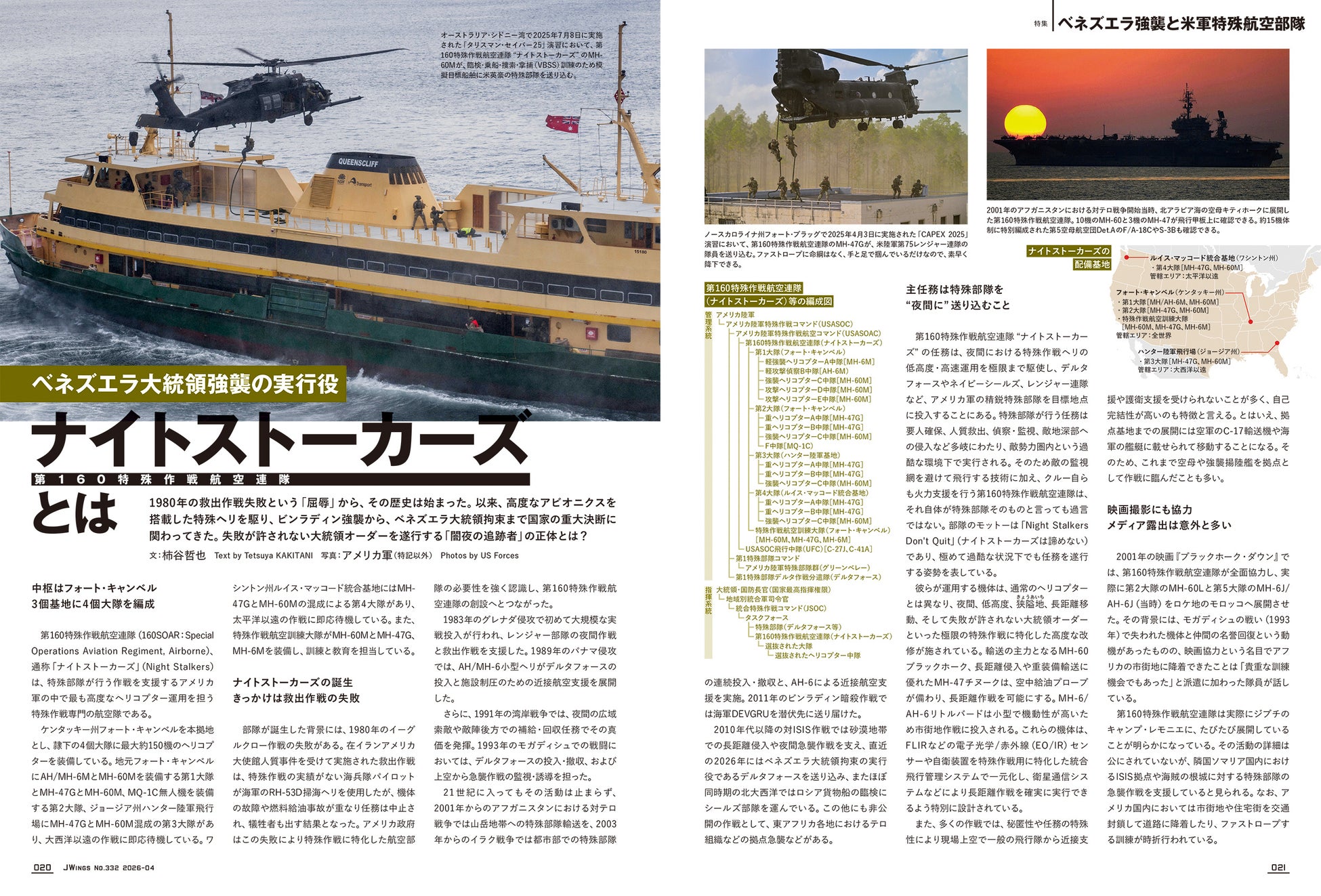 本号特集記事では、作戦の最大拠点となったプエルトリコの現地写真とともに、この作戦に投入された軍用機の機種・所属・機数・役割を詳細に分析し、さらに作戦の中核を担った米陸軍特殊航空部隊「ナイトストーカーズ」と、それを支えた空軍特殊作戦コマンドの実像に迫ります。