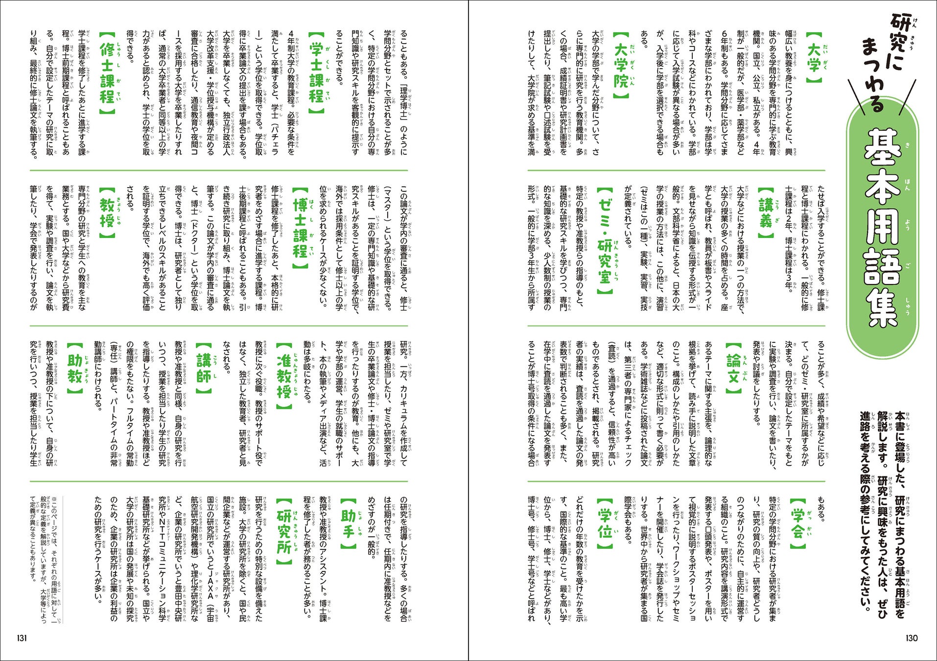 興味のあるテーマから向いている学問がわかる診断や、大学などで研究者をめざすなら知っておきたい「学位」「論文」などの言葉の意味を解説した用語集がついています。進路を考えるうえで参考になります。