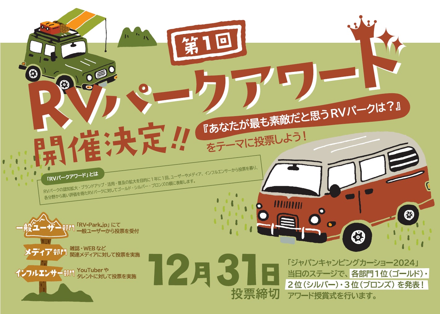 全国のRVパークの認知拡大・ブランドアップ・活用・普及の拡大を目的に1年に1度、「あなたが最も素敵だと思うRVパークは?」というテーマのもと、ユーザーやメディア、インフルエンサーから投票を募り、各分野から高い評価を得たRVパークに対してゴールド(1位)、シルバー(2位)、ブロンズ(3位)の順に表彰します。
