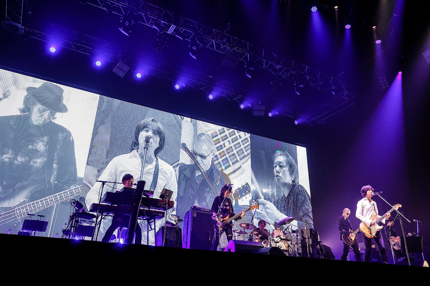 ステージにメンバーが現れ、スライドギターの音色とともに始まったのは「Sky is blue」。アルバム『昇れる太陽』('09年)の1曲目にして、2010年の新春ライブや2014年のさいたまスーパーアリーナ25周年ライブでもオープニングを飾ったナンバーだ。