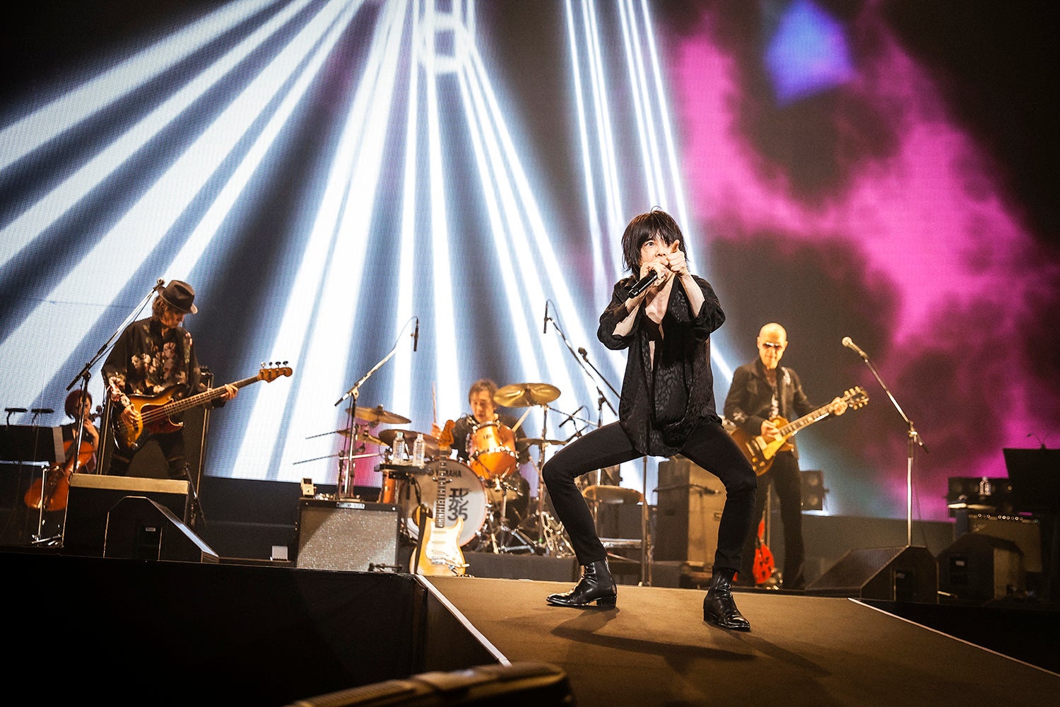 髪を剃り上げた石森敏行がステップを踏みながらギターをかき鳴らし、帽子を被った高緑成治が寡黙にベースで重低音を響かせ、ドラムスの冨永義之が会場最深部まで届くように渾身の力でスネアを叩く。そこにサポートメンバーとして、キーボードの蔦谷好位置、ギターのヒラマミキオが加わり、音の塊となってアリーナ全体を制圧していく。