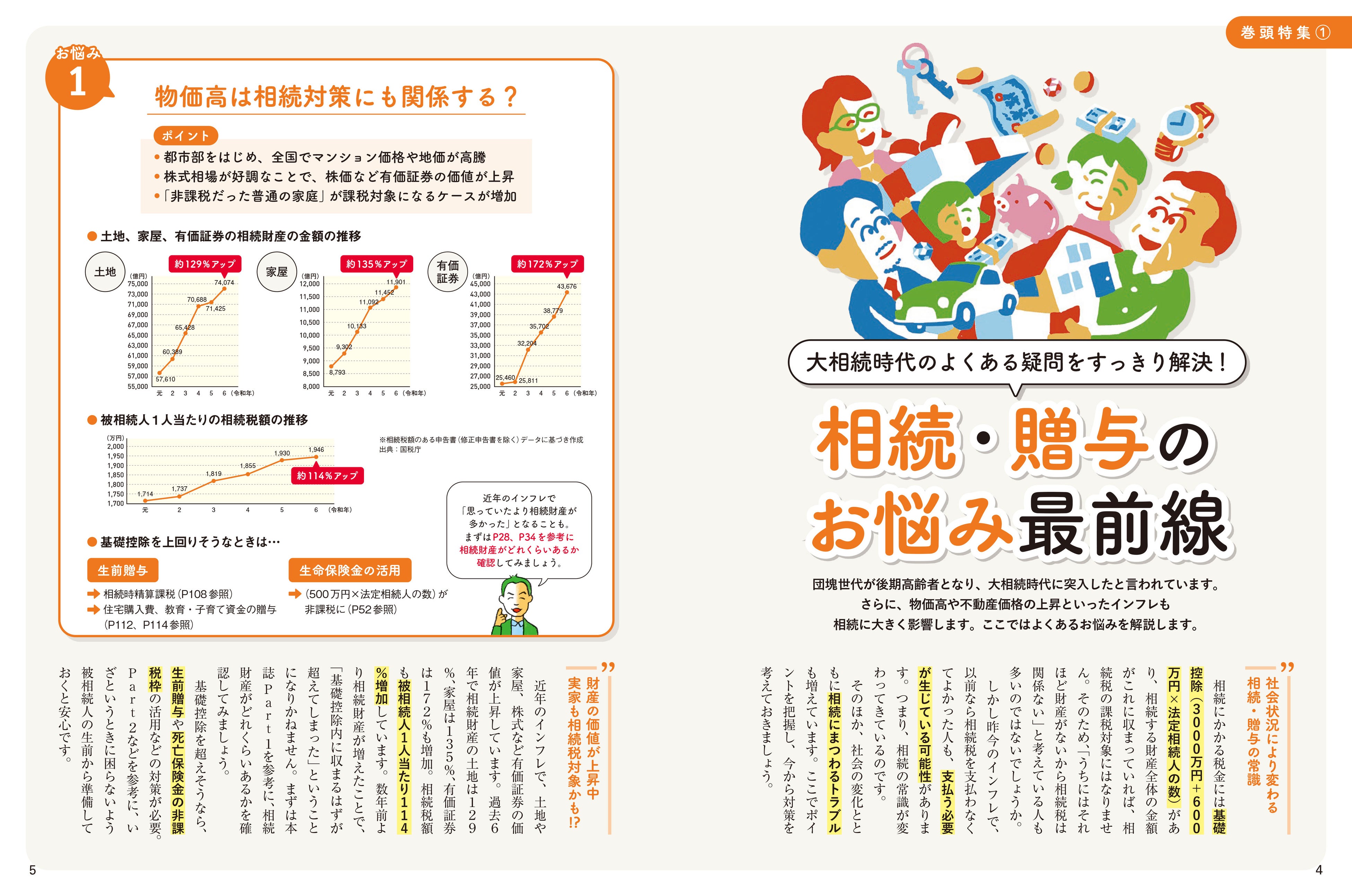 しかし、相続や贈与は制度が複雑で、税制改正によるルール変更もあるなど、いざ知りたいと思っても初心者は難しく感じるテーマです。本誌では、「相続」「贈与」に分けて、被相続人が存命中にやっておくべき「相続対策・贈与」から、相続発生後に待ち受ける「遺産分割・手続き」まで、わかりやすく解説します。