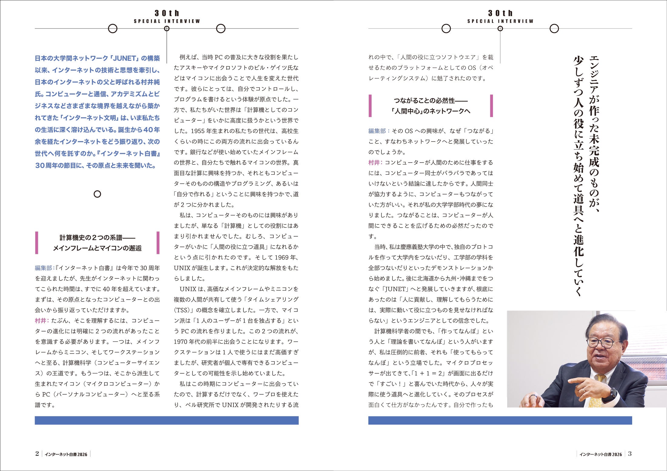 2026年度版では、30周年特別企画として、人々が日常的に享受してきた情報空間を支え、AIなど新たな技術が花開く未来へと続くインターネットの「使命」を“日本のインターネットの父”と呼ばれる村井純氏(慶應義塾大学教授)が語るインタビューを収録しています。