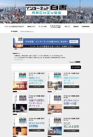 「インターネット白書ARCHIVES」(インターネット白書アーカイブス)は、インターネットの黎明期(1996年)からの歴史を年鑑として発行し続け、2026年版で30周年を迎えた『インターネット白書』のバックナンバーをデジタル化し、無料で検索・閲覧できるようにしたウェブサービスです。発行後1年を経過したインターネット白書をアーカイブスに登録しているほか、1994年から2006年まで株式会社インプレスが発行していた月刊誌『インターネットマガジン』のバックナンバー検索サービスも統合しています。