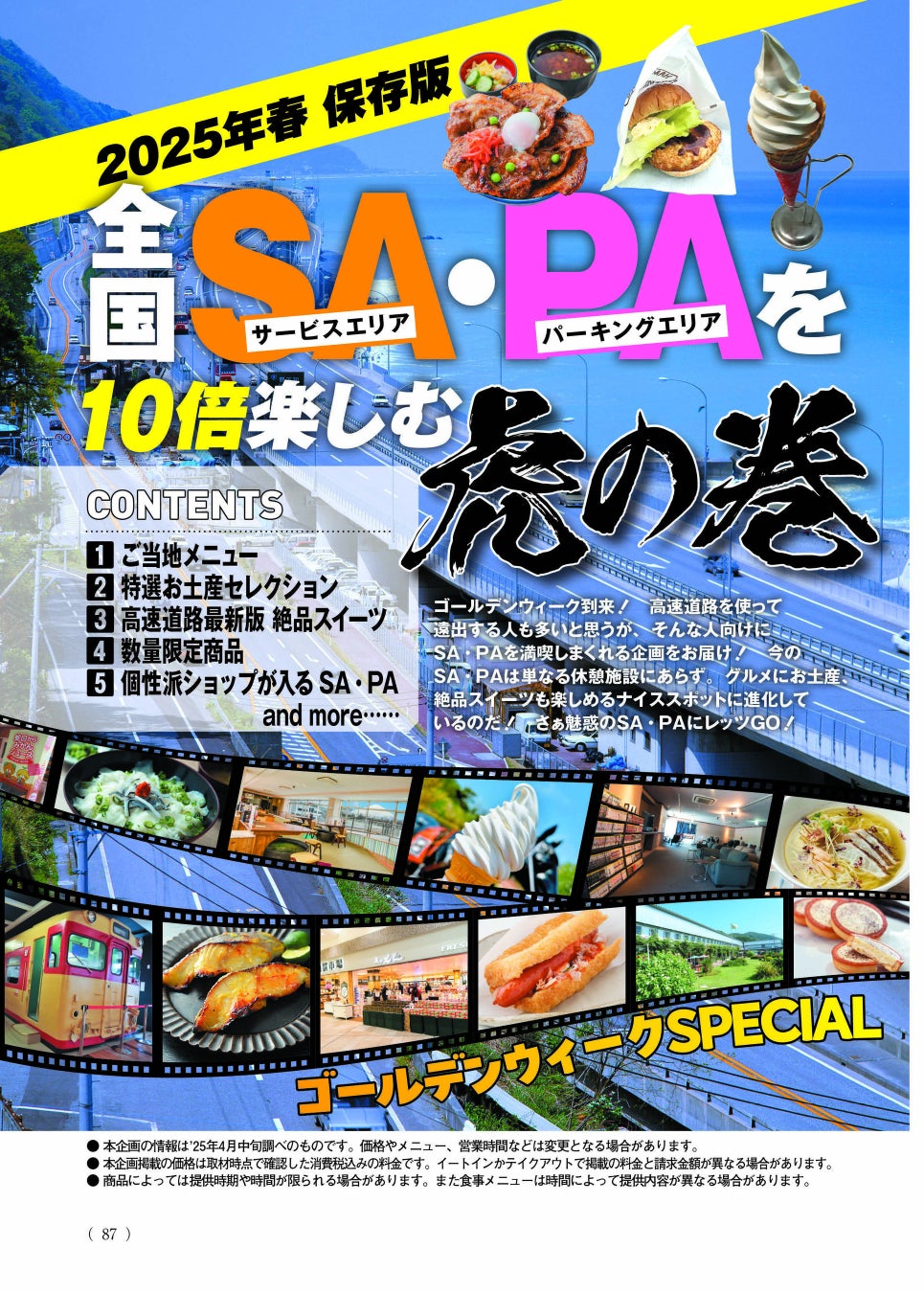 日本全国のSA・PAで食べられるご当地グルメやお土産情報はもちろん、数量限定商品情報や個性的なショップ紹介、さらにはロングドライブの疲れを癒す休憩スポット情報やガソリンスタンド空白地帯MAPなど、知りたかったお役立ち情報が満載!!