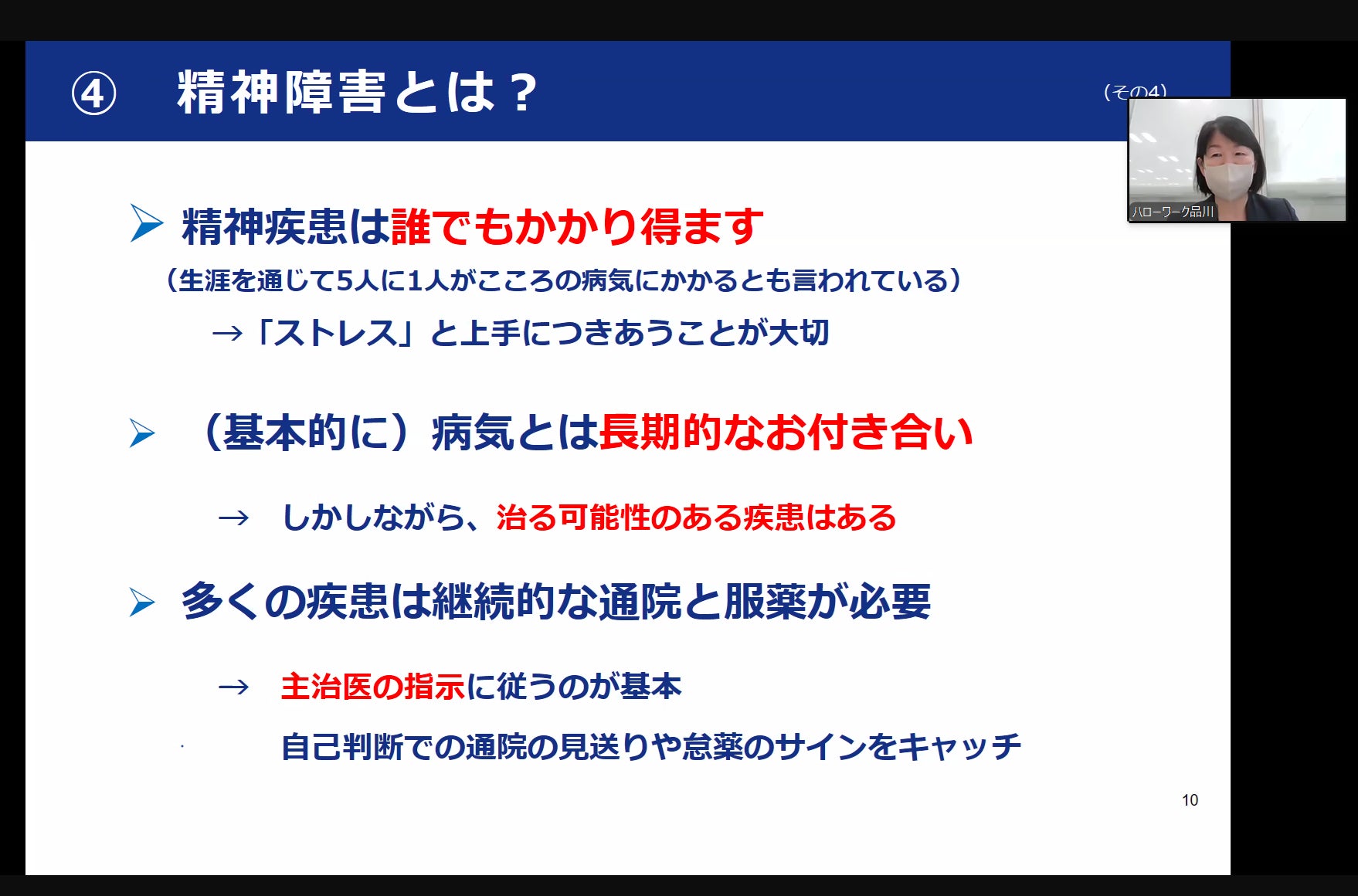 今回の講座は、ハローワーク品川の公認心理師・精神保健福祉士の方を講師に迎え、精神・発達障害について正しく理解し、職場において精神・発達障害者を支援する応援者(精神・発達障害者しごとサポーター)となれることを目的にお話しいただきました。