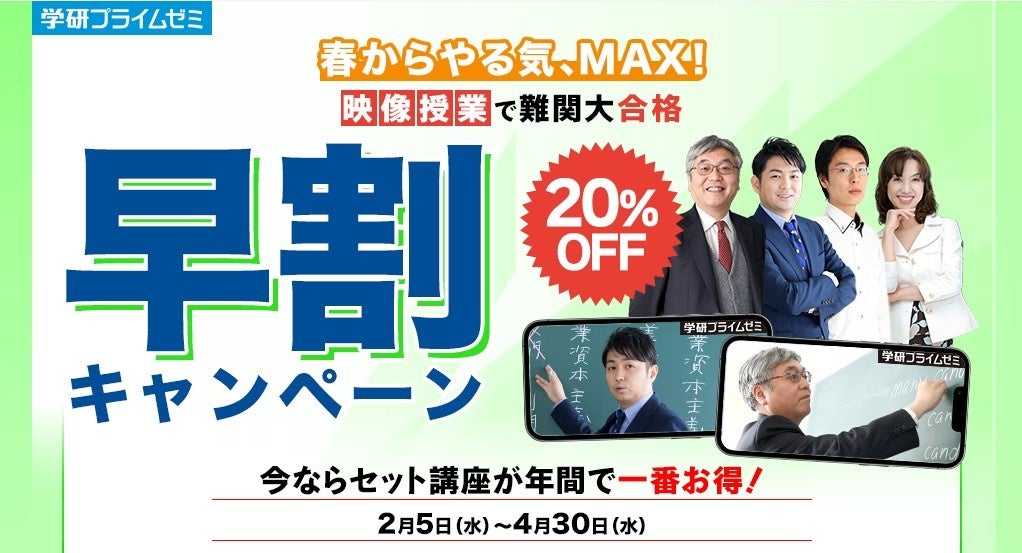 【学研プライムゼミ】20%OFF早割キャンペーンスタート! 今が最大のチャンス!! 超人気講師陣による映像授業で、難関大合格をキミの手に。