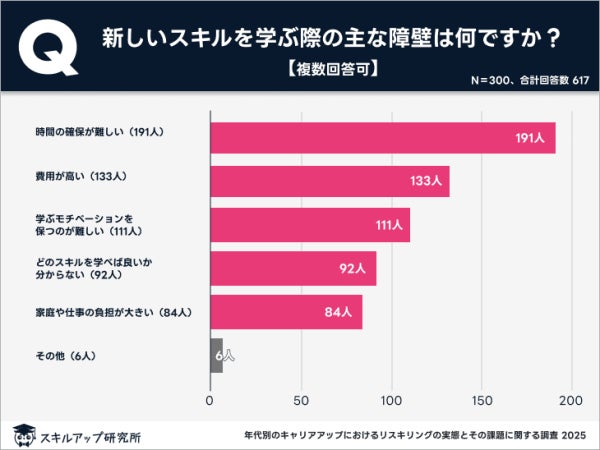 新しいスキルを学ぶ際の主な障壁を尋ねたところ、「時間の確保が難しい」が191人で最多となった。また、「費用が高い」が133人と続いた。