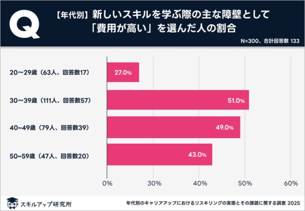 一方で、20代では27%と他の年代より低い結果が出た。このことから、若年層は学びに投資する価値を認識している、あるいは、企業のサポート(研修費用負担など)を積極的に利用しているといった傾向がうかがえる。