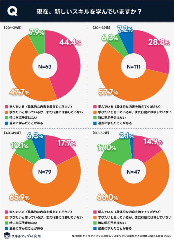 一方で30代以降は「学びたいがまだ行動に移していない」割合が増加し、特に40代以降では「特に学ぶ予定はない」という回答が増えている。