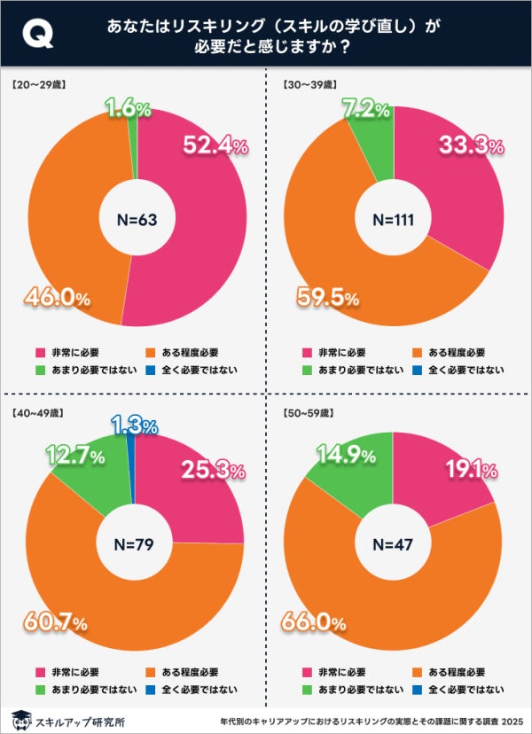 リスキリングの必要性を感じるかという問いに対して、20代では52.4%が「リスキリングが非常に必要」と答えた。一方で50代では19.1%と、必要性を感じる人の割合がわずか5人に1人に留まっている。