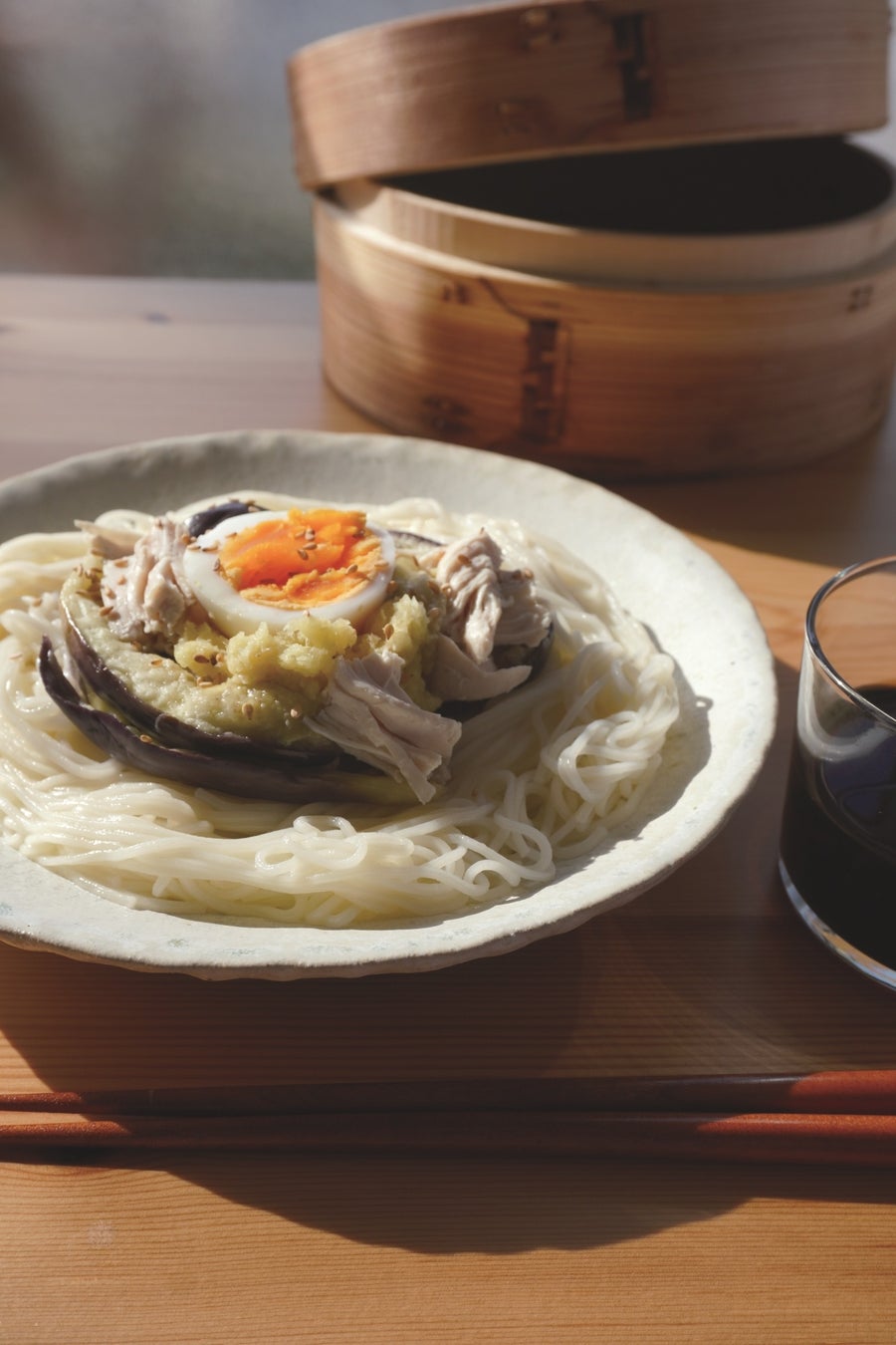 ・蒸しなすと蒸し鶏の冷や熱そうめん