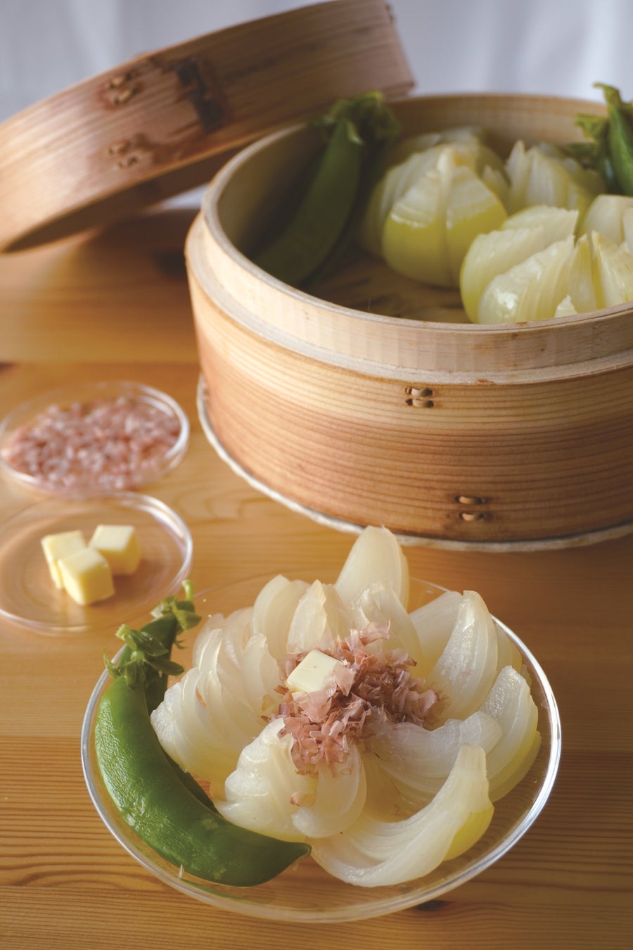 ・新玉ねぎとスナップえんどうのまるごと蒸し