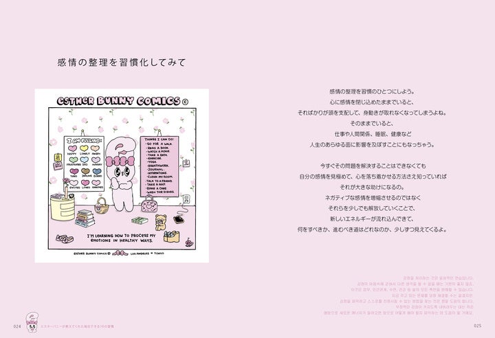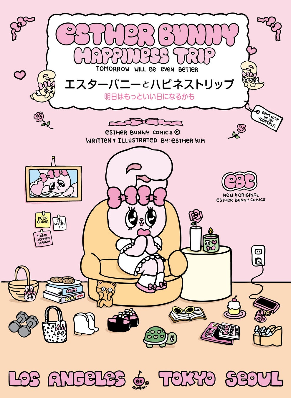 現代人の心をほぐしてくれる「エスターバニー」のイラストエッセイ韓国発の愛らしいうさぎのキャラクター、「エスターバニー」は、 POP でキッチュでガーリー。そしてファッションも大好き。世代や文化を超えたメッセージを届け、自分自身を愛することを教えてくれる存在です。Z 世代の各種トレンド調査では人気キャラクターとして名を連ねる話題っぷりで、2024 年には日本各地でなんと 40 か所ものポップアップを実施。長蛇の列を作り、幅広い世代の人々からの指示を誇りました。